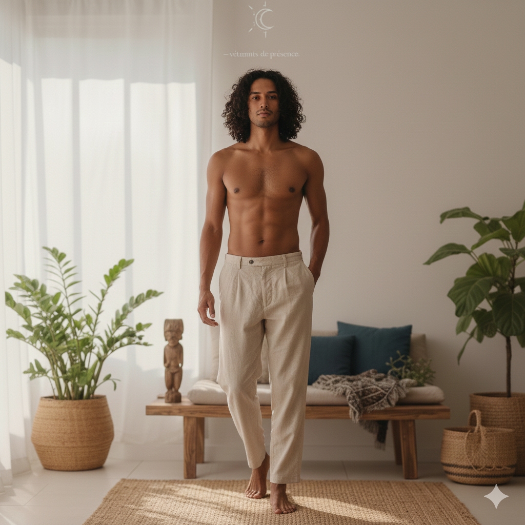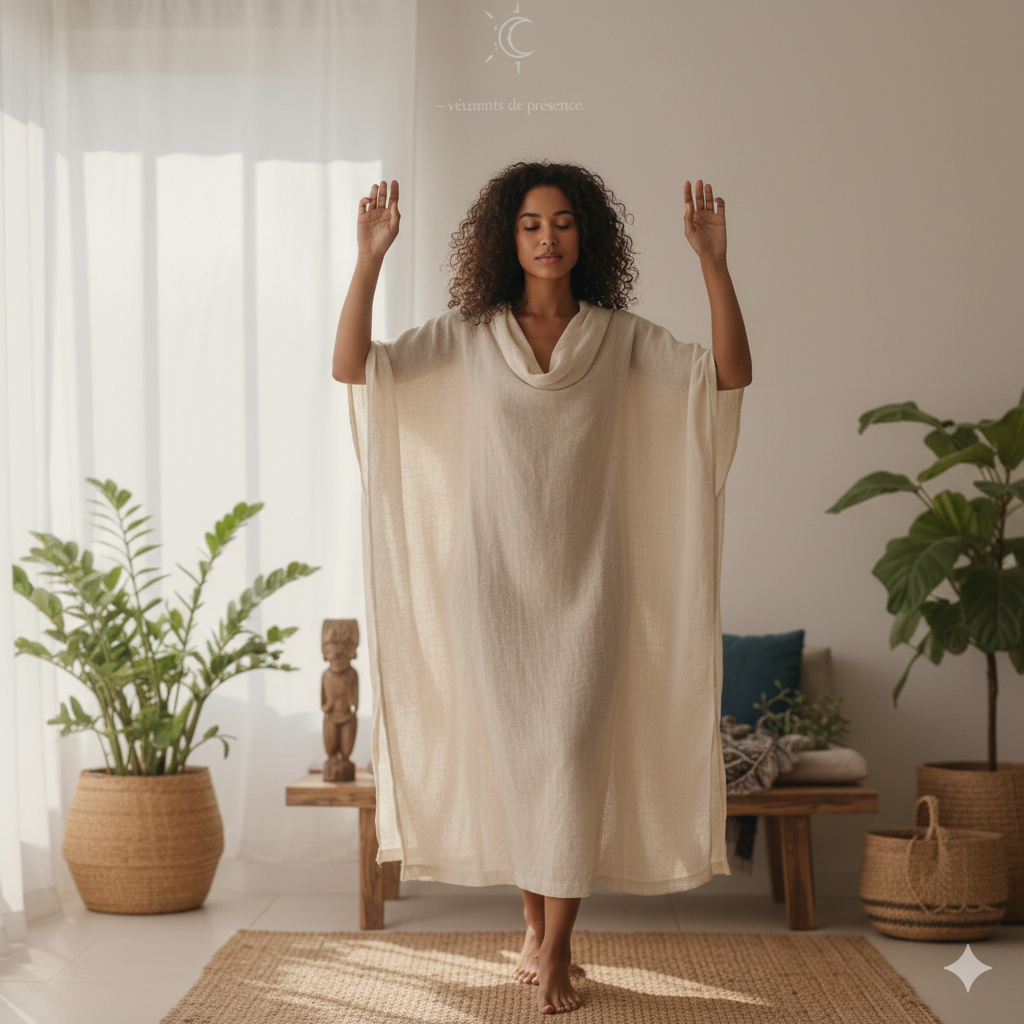 Nous créons des vêtements de présence – des pièces fluides, naturelles et vibrantes, pensées comme des portails vers soi. Chaque création porte une intention, un souffle, un mouvement. Ici, la mode devient un rituel, un espace où le corps, la matière et la lumière intérieure se rencontrent.